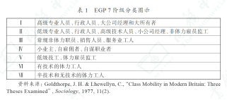 戈德索普在《现代英国的社会流动与阶级结构》(Social Mobility and Class Structure in Modern Britain)一书中,依据职业分类和市场状态,提出了一个包含七类阶级的分类图示(即EGP7阶级分类图示,见表1)。