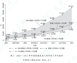 图1 2003-2021年中国城镇家庭人均年收入中位数和中等收入群体区间(单位:元)