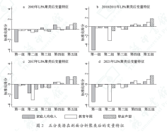 LPA是一种基于潜变量模型的聚类方法,假设调查数据中观察到的收入、受教育年限和职业社会经济地位三个变量能够被没有观测到的潜变量(即个体所处的阶层)所解释,每个群组中个体的观测变量有着类似的特征。LPA通过最大似然估计的方法估算每个个体分配到各个组之间的概率,并根据最高概率来分配个体相应的群组。在进行LPA估计的时候,需要设定分组的数目,并通过信息准则选取最佳分组数。在具体的分析中,由于每期数据的特征存在差异,最佳分组数大致为4-6组不等,考虑到模型拟合的现实意义,本文最终采用五分组的LPA模型进行拟合。以四期(2003年、2010/2011年、2015年和2021年)数据的模型拟合结果为例,图2呈现了五分组之后,每组样本中标准化后的收入、教育和职业地位指标的均值,其中第一、第二组的占比较少,是某项特征存在明显低值的底层群体,第三组的占比较多,三个指标均低于总体均值,第四组、第五组的三个指标皆高于总体均值。经过综合考虑,本文将社会阶层明显更优的第四类、第五类合并为中间阶层。