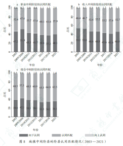 再次,在阶层认同匹配方面,城镇中间阶层很少出现向上认同的情况,主要表现为认同一致或向下认同。历年来,有大约40%-50%左右根据客观标准被界定为中间阶层的城镇居民认为自己属于较低的阶层,表明我国居民“阶层认同偏低”的现象确实存在。在2021年之前,向下认同的城镇中间阶层比例呈现下降的趋势,但2021年有回升的迹象。我们认为有可能是因为新冠疫情等突发事件对城镇居民的阶层认同产生了负面的影响。当然,其后续的变化仍有待加入更多年份的数据进一步考察。
