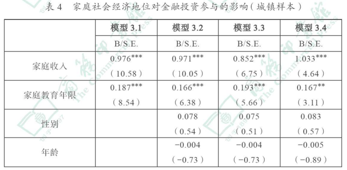 表4:家庭社会经济地位对金融投资参与的影响(城镇样本)。