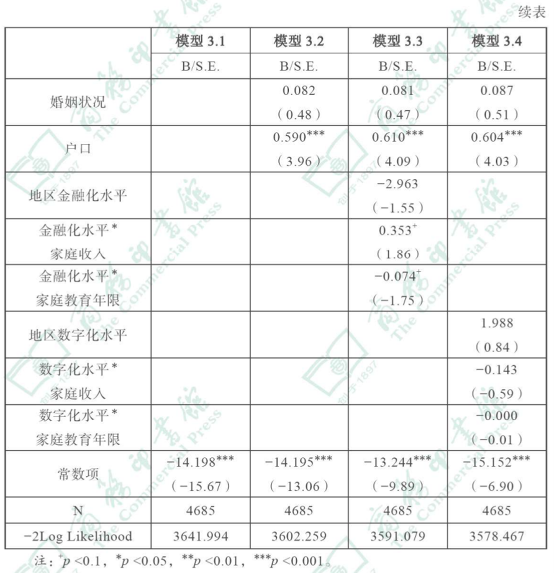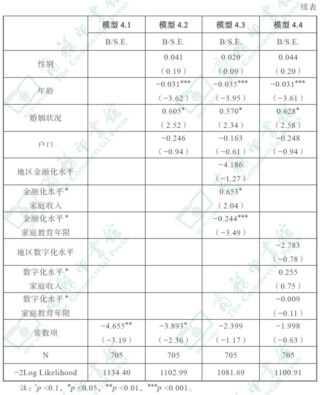 模型1、模型2分析的是全国样本。考虑到农村地区整体金融发展比较弱,农村金融投资比较少,我们又针对城镇地区样本重复了上述分析,同时可以对上述结果做一稳健性检验。模型3分析了城镇家庭的金融投资参与情况,结果与模型1几乎一样。具体来说,家庭收入与家庭教育年限系数显著为正,家庭收入与地区金融化水平交互项显著为正,家庭教育年限与地区金融化水平交互项显著为负,二者与地区数字化水平交互项都不显著。由此可见,在城镇地区,家庭经济资本与人力资本都有助于金融投资参与;随着地区金融化水平提高,家庭经济资本的积极作用会扩大,而家庭人力资本的积极作用则会缩小;地区数字化水平则不会影响金融投资的参与鸿沟。