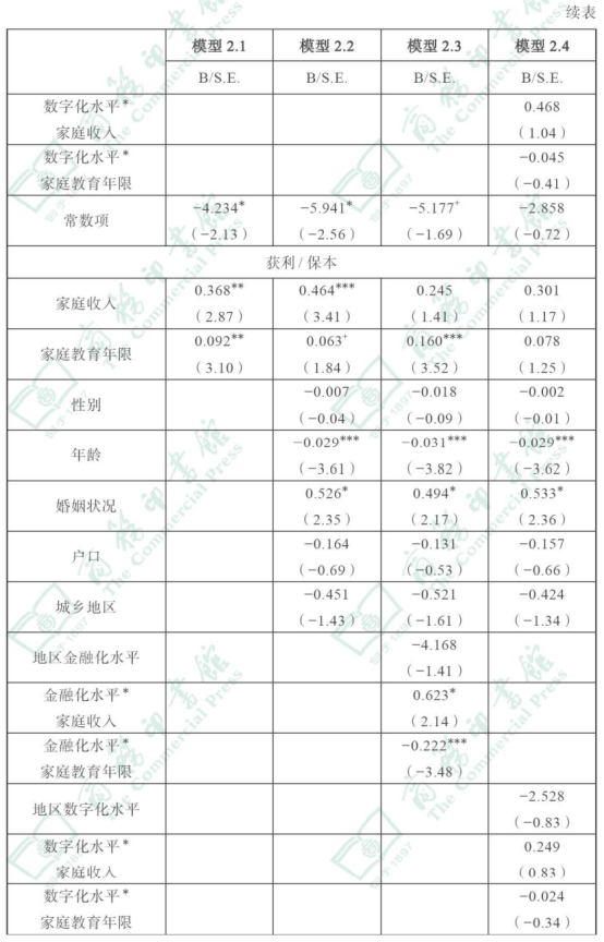 最后,模型2.4在模型2.2基础上加入数字化水平及其与家庭收人、家庭教育年限的交互项。加入这些变量后,家庭收人、家庭教育年限以及数字化水平与二者的交互项系数均不显著,这说明在数字化水平不同的地区,家庭收入与家庭教育年限对金融投资收益的影响没有明显区别。也就是说,数字化水平对金融投资的收益鸿沟没有影响。