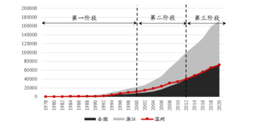图为1980——2020 年,全国人均 GDP、浙江省人均 GDP 和温州市人均 GDP。