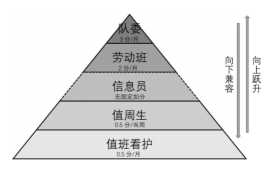 每月额定加分相当于各岗位学员按照规范层级中身份发放的“固定工资”,如图2所示,按由低到高的层级排列依次是值班看护、值周生、劳动班和队委。岗位人员的分布近似于一个金字塔,岗位越高,人数越少,最低层级的值班看护几乎涵盖所有学员,最高层级的队委只有两三人。层级越高,职责越重要,额定加分也就越多。信息员虽承担重要职责,但其正式身份相当于打零工,因而没有额定加分。