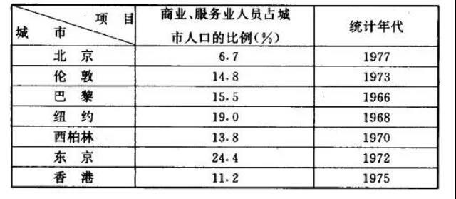 从世界上几个大城市商业、服务业人员占城市人口的比例来看,我们北京的比例是最低的。