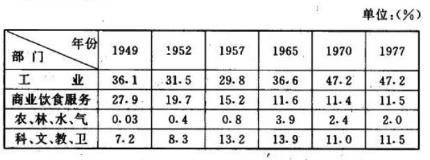 一九四九至一九七七年北京市各行业职工在全部职工中的比例的变化情况: