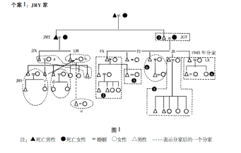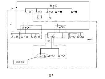 在图1中,JMT和JGT分家后,逐渐发展出两个各自独立的家族。在JMT这个系谱中有两个儿子JX和LM,这两家于1942年分家;第三代JRS(c)与其父也于1942年分家,三子LZ(d)与其父于1954年分家;JLM这边因无子,过嗣其兄二子LR,LR与其父1954年分家,分出之家为e;如此就形成了a与c、d和b与e的本家(父母之家)和分家的关系,这里,事实上e为a的分家。在JGT家的系谱中,其5子于1945年分家,到60年代除3为分出之家外,其它各家都未分家,但各家的家庭类型呈现出不同的结构,其中2、4、6为扩大家庭,3和5为核心家庭,3因当兵已迁往外地。
