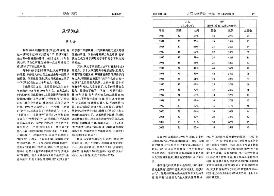 2005年,学志主编、中文系博士生柳春蕊发起组织创刊二十周年大会,邀请部分老编辑出席,还筹划出版了一期特刊。我作为社会学的学科编辑,邀请从香港科技大学毕业回北大的周飞舟老师写回忆文章,题为《以学为志》。周老师对1986-2003年间一千余篇发表在《学志》上的论文,进行编码,统计其学科、每期篇数等,做了初步的量化分析。虽然已经在本科、硕士阶段学过两遍《社会统计学》,我还是对这种有别于社会调查的“无中生有”式的编码、分析、解读的研究方法颇为叹服。此次约稿,埋下了我后来前往港科大追随周老师导师——龚启圣教授攻读经济史博士的种子。