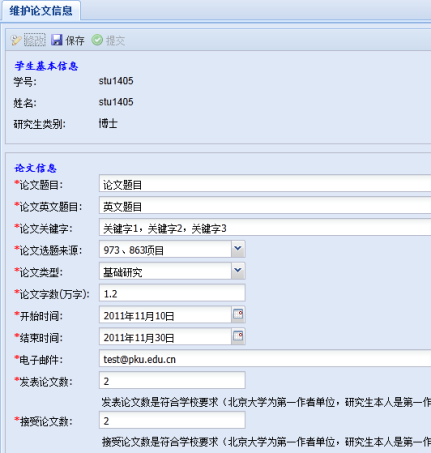 注意:一旦点击【提交】按钮后,论文信息即进入待审核状态,系统不允许研究生再进行修改。如果因特殊原因确需要修改的,可联系本院系研究生教务老师进行操作。