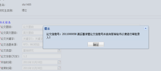 6、 将系统生成的登记号和一本侧面写有学号的学位论文提供给答辩秘书,供答辩秘书送审使用;