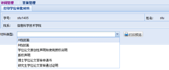 登陆综合信息系统→学位管理→博士论文送审→打印材料→选择相应项目,录入、保存、打印、签字。