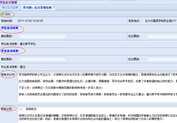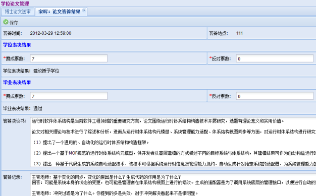 12、 答辩后,将答辩记录和答辩决议录入学生系统。打印“攻读博士学位论文答辩记录”和“答辩委员会决议书”,并签字(因要存档,请务必清晰打印)。