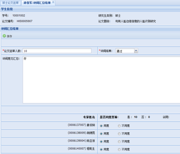 3. 统计并录入论文评阅结果,录入完成后点击【保存】。