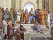 拉斐爾所繪製的《雅典學院》,畫面中央以手指指天者爲柏拉圖,平舉右手者爲亞里士多德。圖片來源:Musei Vaticani。
