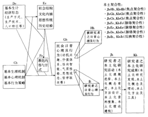在立基於“人類與環境互動論”的基礎上,楊指出,被研究者的心理與行爲,會同時受到生物性進化、遺傳因素,與社會、經濟、文化、哲學、歷史等脈絡性因素,兩因素集的單獨性影響,以及兩者間相互作用之結果的兼顧性影響。所以,若要瞭解中國人的心理與行爲,研究者就必須同時根據這些因素,“提出妥切的問題,建構合適的理論、設計有效的方法”。另一方面,根據知識社會學的說法,知識會受到其所從出的社會、文化、經濟等等脈絡性條件的制約。所以,在不同的國家、或社會,研究者的“研究活動”(J)、“研究成果”(K),會有所不同,且各有特色。
