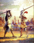 騎士決鬥(duel)形成於歐美的一種有着特定規則、特殊作用的對決,決鬥雙方需要有公證人監督作證,還需要朋友作爲助手(以防對方陰謀以衆凌寡)。爲體現公平的紳士精神,雙方事先約定使用的武器和決鬥方式。圖源:百度圖庫。
