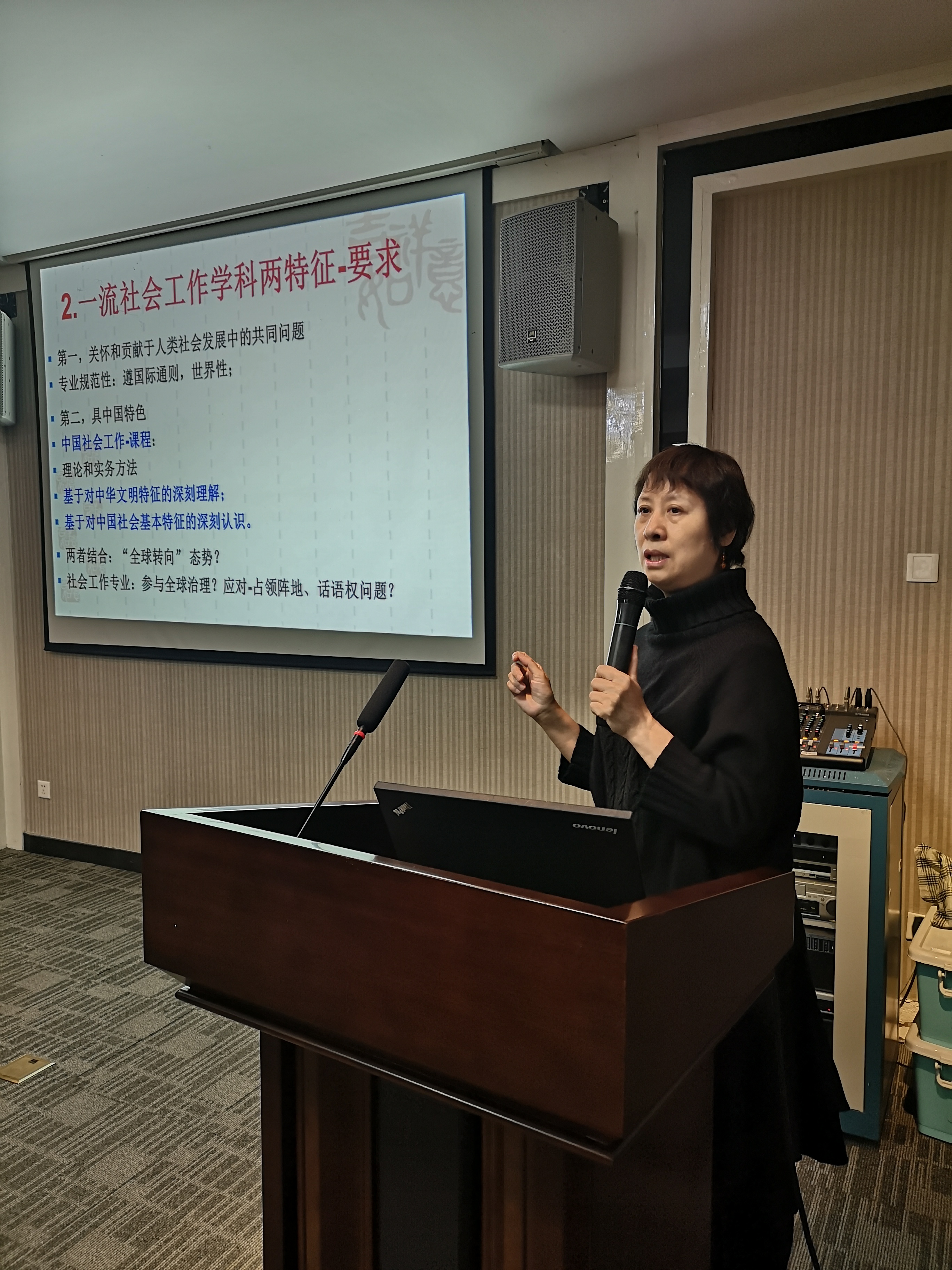 随后,社会工作专业负责人马凤芝教授就社会工作专业课程建设项目进行详细介绍。她表示近期社会工作专业一流评估和MSW学科评估正在进行,是对社会工作专业的激励,也是挑战。社会工作专业课程建设得到学校、社会学系的鼎力支持,希望老师们鼓励学生更多地参与实践,参与大学生论坛或者创业大赛,让学生走进这个行业,看到这个行业的未来。