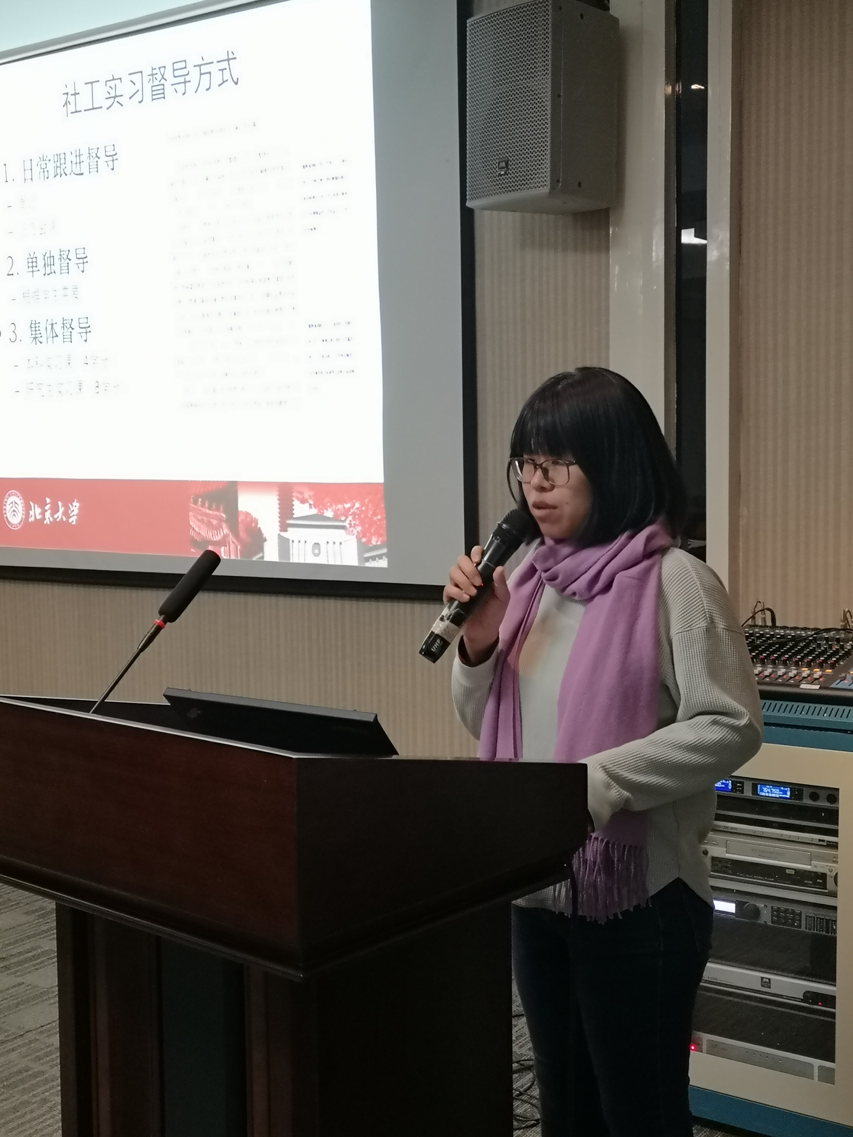 刘冬妮老师作为社会工作实习督导,重点介绍了《社会工作实习(本科)》、《社会工作实习(硕士)》教学内容大纲及实习督导安排。社会工作实习课程围绕社工核心能力展开,以实习课和督导形式实行。同时刘老师表示社会工作作为实践性学科,为了促进学生更好的参与实践,建议加强与实习基地的联系与互动;同时发展校内实务团队,推进校内社会工作服务,提升社会工作学生实践与研究能力。