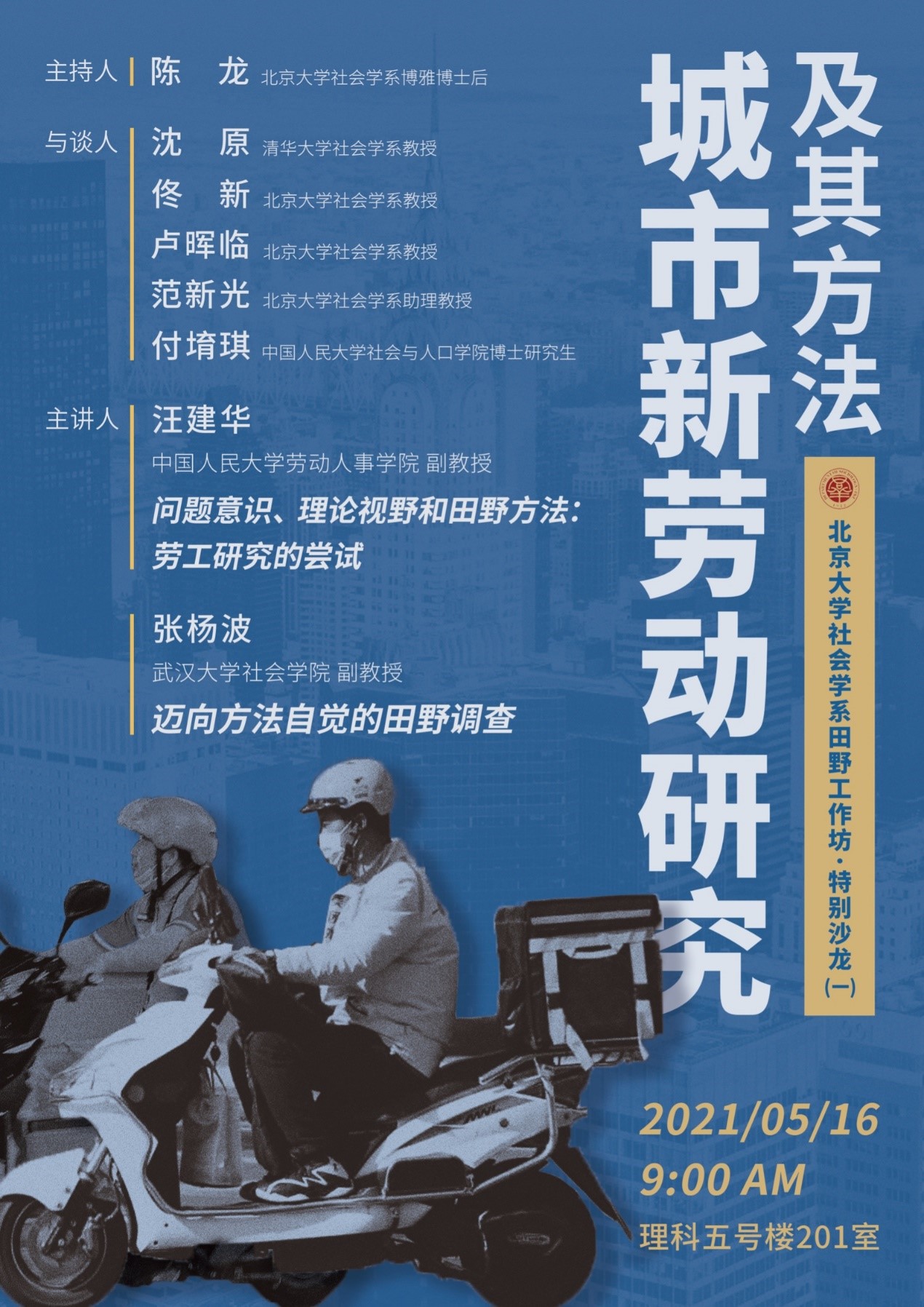 北京大学社会学系田野工作坊致力于为本科生提供田野实践分享交流的平台。本期特别沙龙邀请到中国人民大学劳动人事学院汪建华副教授和武汉大学社会学院张杨波副教授进行研究报告。汪建华副教授曾深入珠三角的加工工厂与社区,开展民族志研究;张杨波副教授则把研究视角转向近10年日渐兴盛的互联网平台快递员工。他们在各自的民族志研究中积累了丰富的田野经验和方法论思考,他们之间的碰撞不仅有助于了解劳动社会学研究主题的变迁,而且有助于田野民族志方法和经验的提升总结。