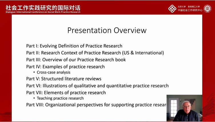加州大学伯克利分校Michael J. AUSTIN教授分享了过去25年来自己在加利福尼亚湾区进行的实践研究。首先他从实践研究定义的发展流变切入,结合美国案例和一些国际经验进行了分享;接着,他结合实践研究手册,展示了一系列社会工作实践研究的例子。Michael J. AUSTIN教授探讨了结构性文献回顾的流程,包括话题确定、类别选择、关键词设置、排除和纳入标准、寻求反馈等要素,这区别于系统文献回顾,并呈现出了更多合作的色彩;再次,他结合自己曾做过的研究,归纳了实践研究当中的基本元素与实践研究者的必备技能,如数据挖掘、分析、共享和组织沟通、寻访等。其中,互信关系的建立、信息检索、把握服务对象不同的需求和倾听、好奇心及促进自我倡导等都是很重要的环节;最后,他从大学和机构的角度出发,分析了一项实践研究开展背后的机构支持。Michael J. AUSTIN教授十分期待基于此次会议的这个平台,能够进行更多的国际实践研究的合作,他表示未来将是更美好的图景。