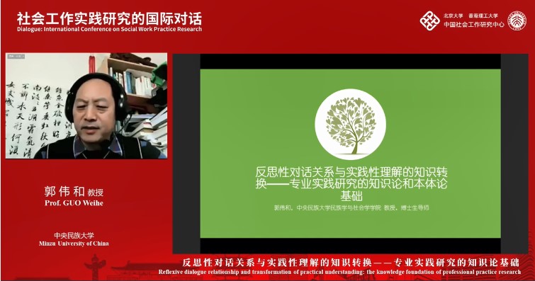 中央民族大学的郭伟和教授以“反思性对话关系与实践性理解的知识转换”为主题,探讨了如何把实践性理解变成一个可澄清的、阐明的、清晰的知识问题。他指出,现有相关专业实践研究大致可以分成两大范式:一是证据为本的专业实践研究及其实证主义的认识论基础;二是反思性的专业干预策略及实用主义的哲学基础。而通过对二者的比较和澄清,实践转向的必要性和重要性便被抛出来了,这是一种更强调实践活动自身跟身体性的关联,以及背后所嵌入的更加宏大的社会的文化脉络及结构制度环境。借由对这一股理论脉络的梳理,郭伟和教授提出了这对于我们专业实践研究的启示:我们需要在本体论层面建立一种实践者跟研究者之间的真诚的对话性、反思性关系,进而需要把不可言明的、直觉性的、身体性的knowing how的知识转换成可言明的,条理化的知识,也进而把能够言明的变成我们自己身体的一种专业实践。