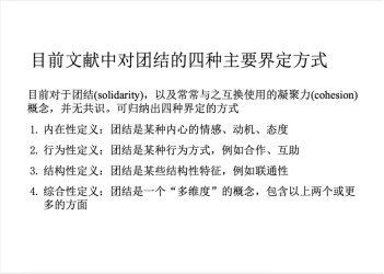 1、内在性定义把团结看作行动者内心的某种情感、动机和态度,一种心理上的纽带和联结关系。这种思路契合团结所传承的爱的传统,以及涂尔干所强调的团结与基于自我利益的计算和交换的差异。