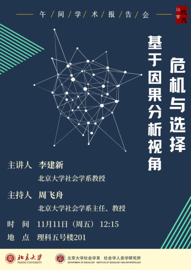 2022年11月11日中午12时许,北京大学社会学系2022年秋季学期第二期午间学术报告会在理科五号楼201顺利举行。本次报告会由北京大学社会学系李建新教授担任主讲人,由北京大学社会学系主任周飞舟教授主持。李建新老师以“危机与选择:基于因果分析视角”为题进行了精彩的学术报告,数十位北大师生及访问学者线下参与本次报告会,现场气氛活跃、讨论热烈。