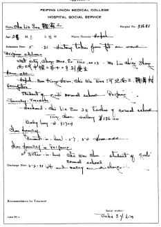 北平协和医院社会服务部所留的一份患者文件。成立于1921年的北平协和医院社会服务部,是国内最早实现建制化的社会服务机构,本文作者宋思明即北平协和医院社会服务部的资深工作人员。图片来源:King, M. Marjorie. “The Social Service Department Archives: Peking Union Medical College 1928-1951.” The American Archivist 59, no. 3 (1996): 340–49.