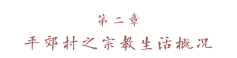 本章叙述平郊村的宗教生活,可分为村内的宗教活动,村外的宗教活动,及其他的特殊宗教崇拜三节来说。