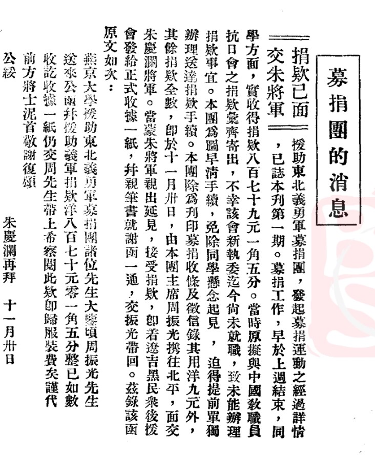 周振光将捐款交给朱将军后所写的报道。图片来源:1932年《燕大周刊》,“全国报刊索引”数据库。