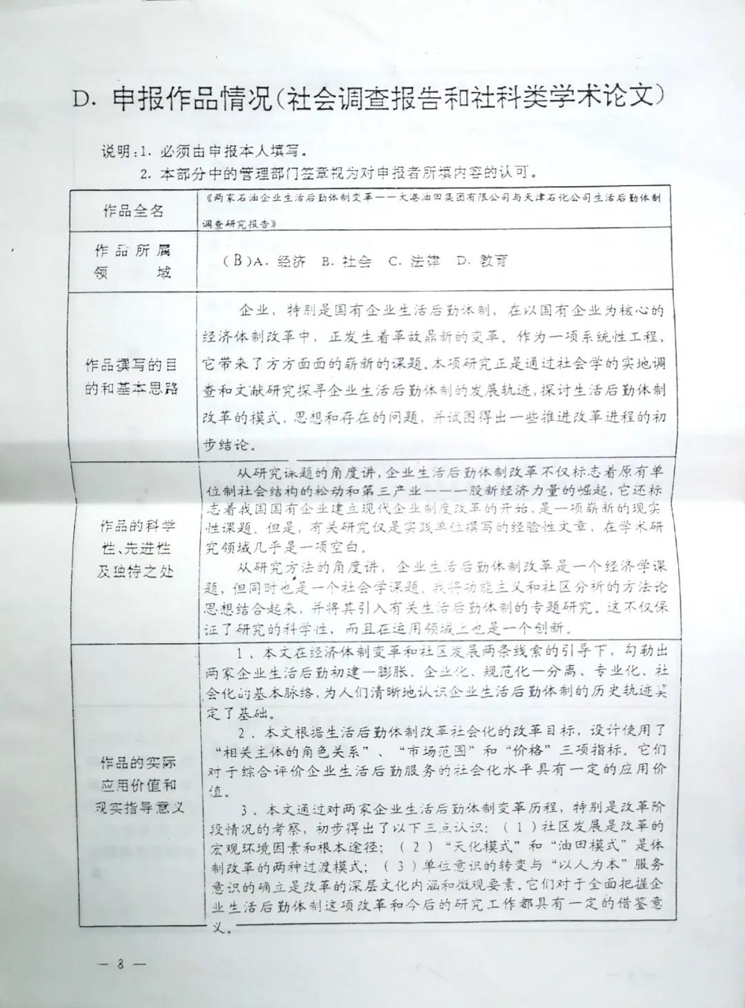 郝津京参加“挑战杯”时的作品申报书与《两家石油企业生活后勤体制变革》论文打印稿。