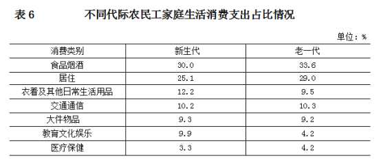 图为不同代际农民工家庭生活消费支出占比情况,可看出新生代农民工消费模式的转变。