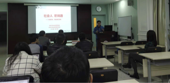 晚7:00,活动正式开始。首先,河北省委组织部2015届定向选调生刘晓亮进行了发言。刘晓亮在发言中首先回顾了自己的择业经历,讲述了面临多份工作的抉择时,毅然选择成为一名选调生的故事。他认为目前的定向选调生在公务员队伍中有优势,并且发展空间较大,同时也结合自己的实践经验介绍了如何将专业优势运用到工作当中。其风趣幽默而富有情怀的分享获得了同学们阵阵掌声。